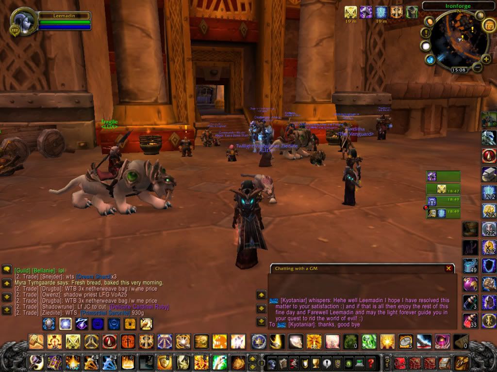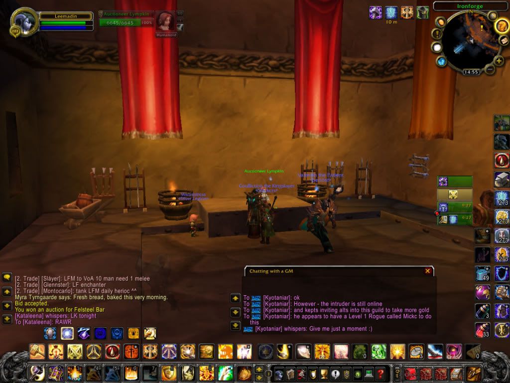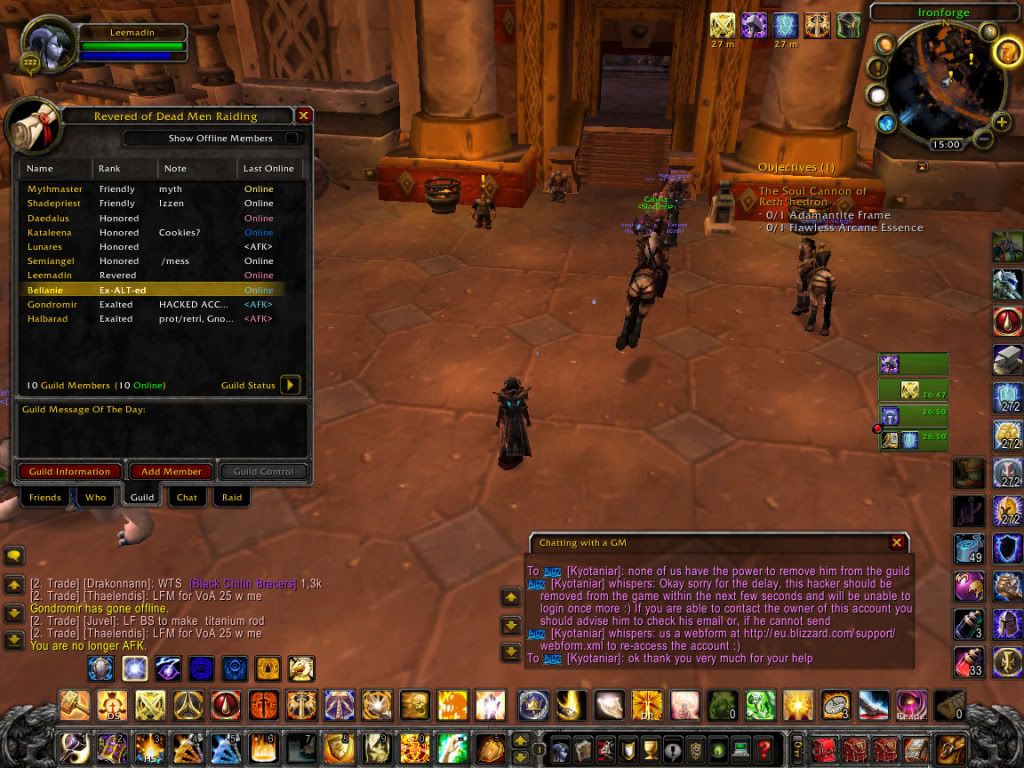 Hi guys. First of all sorry for all the trouble this caused. Thanks Lee for sorting things out and thanks bigtime for annoying my hacker. I feel like building him a new face atm. I have my account back and reinstalled my ENTIRE pc! Yes: format c:\*.* and all that. All the scanners and stuff from the wow-forums could not find any threats on my PC, so to be sure I formatted the entire thing. Took me ages to download all the patches again and redo my UI from scratch, but that seems mostly sorted now. On my mage I seem to have gotten most my gear back, but my priest and druid still miss alot of their stuff. My banks are pretty much ruined and worst of all, I got kicked from my own banking guild with 5 tabs full of stuff. A nice GM got me re-invited last night, however they can't do much about the contents of the GB. There still was a level 1 warlock in there that had been online only a few hours before, well after my account got frozen I might add. Well, the GM promised me my chars will get their main gearset back, if I provide them with a list. Making that atm, hoping I'll get it back soon.