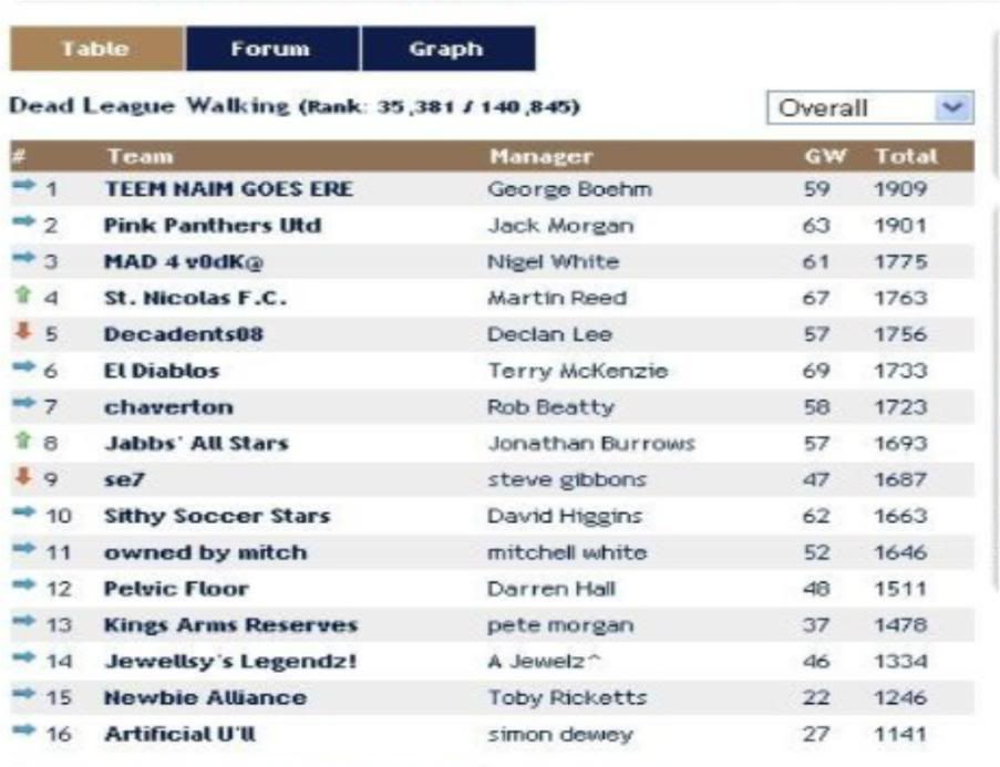 Jack & George are scrapping away for the Deadmen Premier League Fantasy football title. As you all know, George (Butta) is in Mexico but has managed to keep up to date with his team from (I presume) internet cafes. He had a lead of over 50 points at one stage, whittled down by Jack (Tox) to just 12 points with 2 games to go.