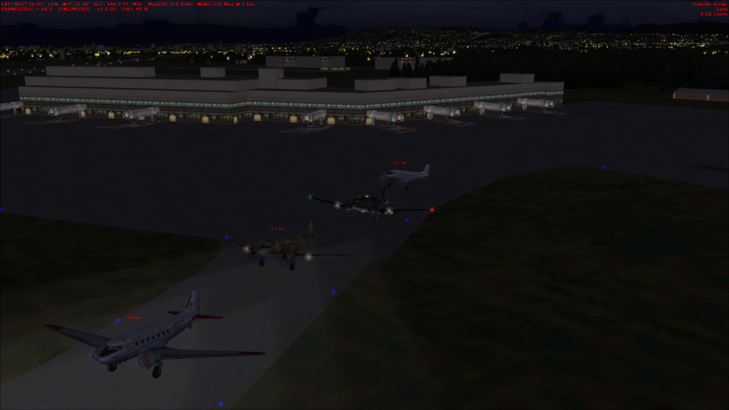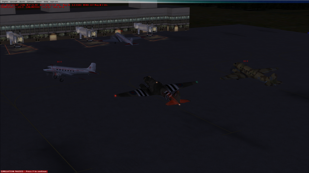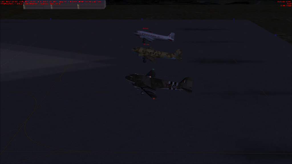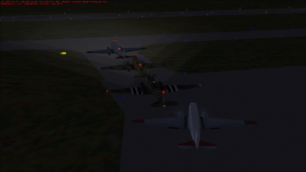 ok so it didn't got as planned, the DC3s were way to slow, so we airbus-ed it instead. Actually a lot of fun, i had a vertical take off due to a mismatched ts key, Tea has something similar, but dived instead, but we all survived and no virtual kittens were killed in the playing of this game. Due to an internal error (me turning of the computer i lost the screen grab of the airbus flight, heres some dc3's (before we canned it) instead