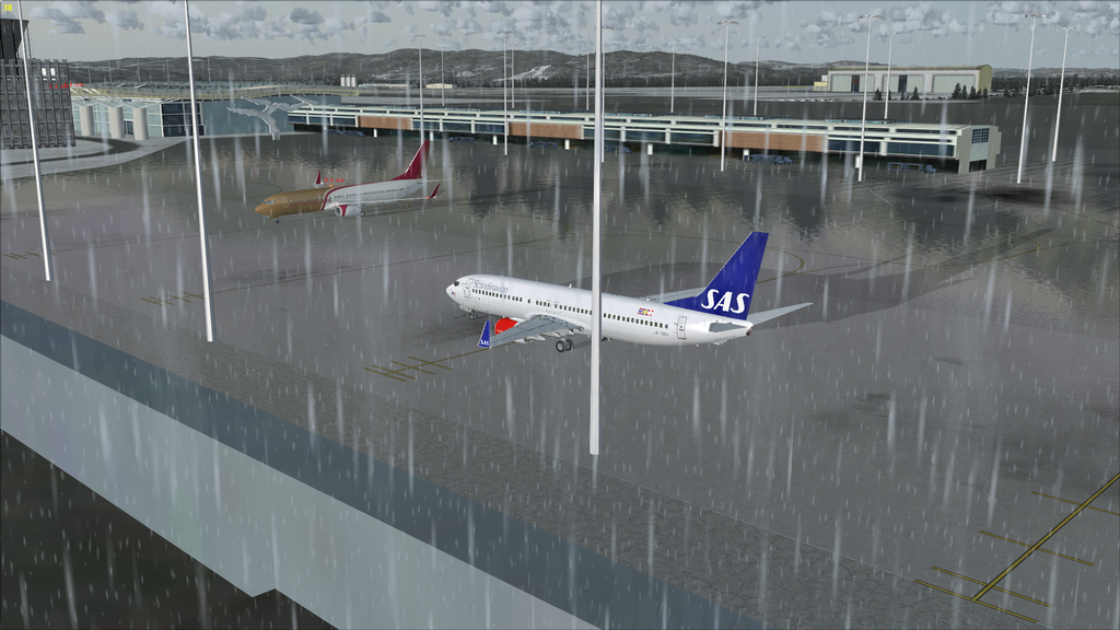 At the start of the evening at Oslo it was snowing, as seen here, with Vobler's twin prop sporting a go-faster sky-blue stripe and my 777 in the Air New Zealand Hobbit livery.